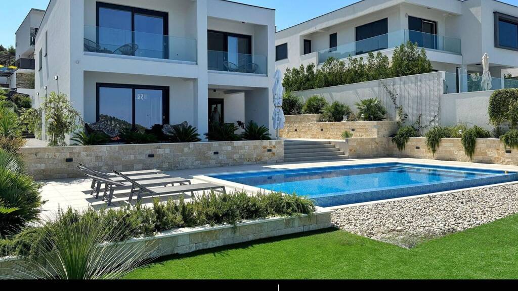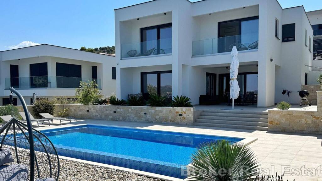 Eine wunderschöne, neu erbaute Villa mit Pool und offenem Meerblick steht zum Verkauf in der Nähe der Stadt Rogoznica, gelegen in einer Sackgasse in einer attraktiven Mikrolage, in der überwiegend moderne Ferienhäuser stehen - nur 100 Meter vom herrlichen Adriatischen Meer entfernt.
