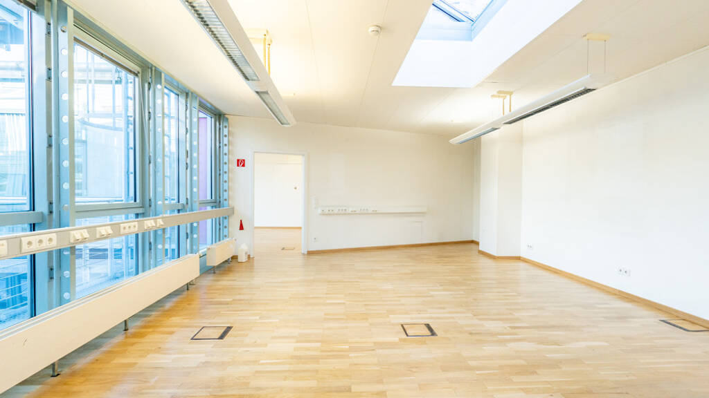Die Büroräume sind großzügig gestaltet und verfügen über große, bodentiefe Fenster sowie hohe Decken mit Oberlichtern, die für eine angenehme und helle Arbeitsatmosphäre sorgen. Die Teeküche und der Sanitärbereich sind mit hellen Fliesen ausgestattet, während in den übrigen Bereichen Parkettböden verlegt sind. Die Beheizung und Warmwasseraufbereitung erfolgen effizient und umweltfreundlich mittels Fernwärme.