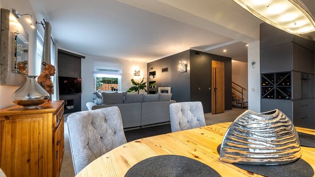 Die Innenräume des Hauses wurden in einem modernen Stil mit hochwertigen Materialien und eleganten Details eingerichtet. Das natürliche Licht, das durch die großen Fenster einfällt, unterstreicht die Großzügigkeit und verleiht den Innenräumen eine angenehme Helligkeit. Die Küche ist nicht nur ein Ort zum Kochen, sondern auch das ästhetische Zentrum des Hauses, mit viel Liebe zum Detail und Funktionalität.