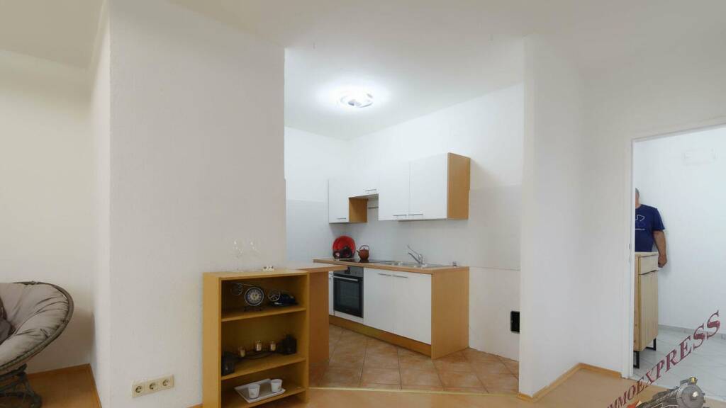 - Aufteilung: Wohnzimmer mit integrierter Küche, Schlafzimmer, Badezimmer mit Badewanne, separates WC