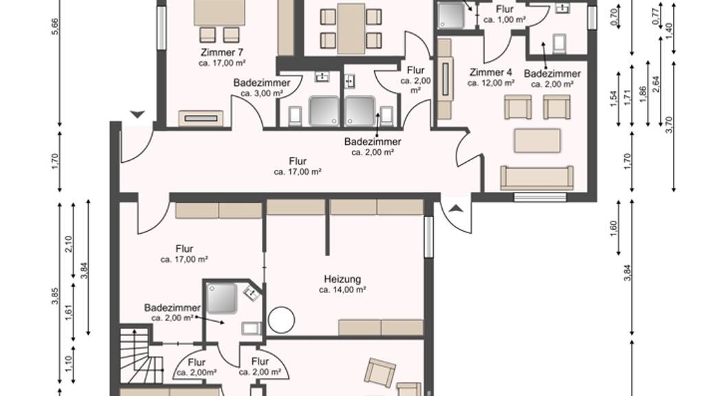 Das Wohnhaus verfügt über eine Vollunterkellerung mit einer Nutzfläche von ca. 171 m² und ist über zwei separate Eingänge zu erreichen. Ausgestattet ist das Souterrain mit 7 Zimmern, 5 Badezimmern und einem Heizungsraum.
