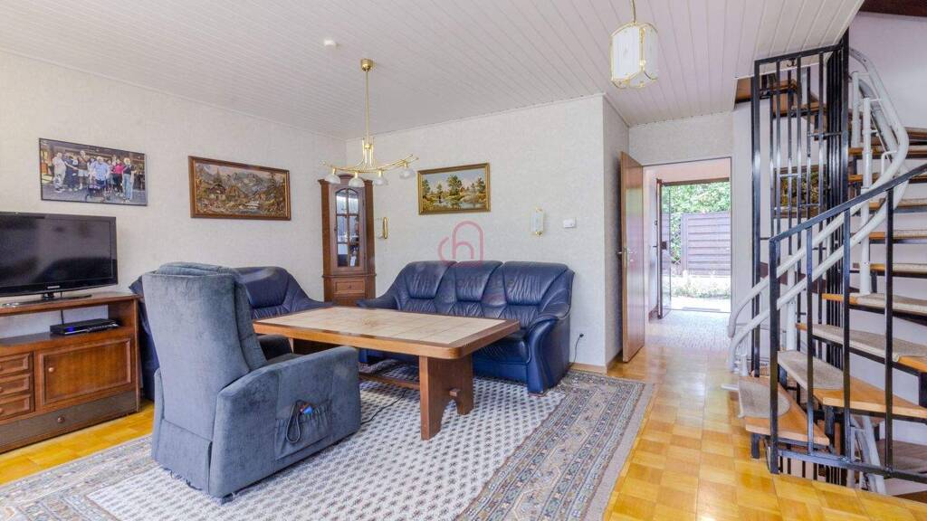Die rund 100 m² Wohnfläche verteilen sich auf ein Erdgeschoss und ein Obergeschoss. Es ist vollunterkellert und liegt auf einem ca. 190 m² großen Gartengrundstück. Eine Garage gehört ebenfalls dazu. Das Grundstück ist Bestandteil eines größeren Grundstücks das Gemeinschaftseigentum mit den Nachbarhäusern ist.