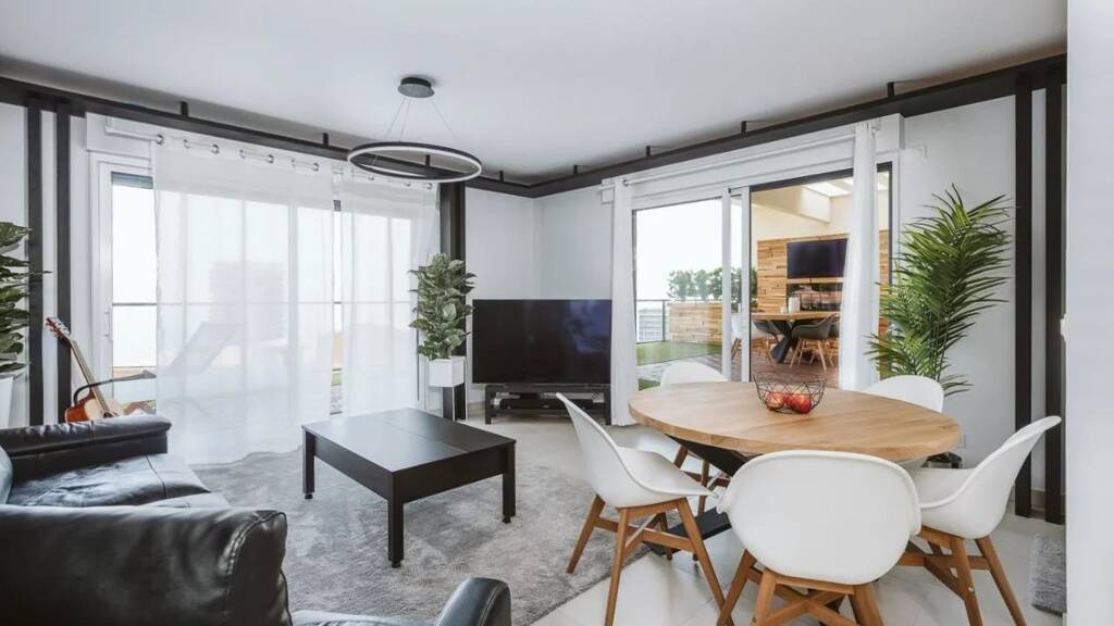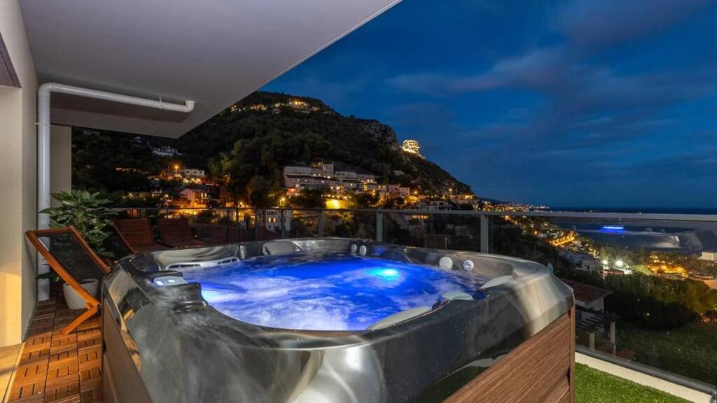 This property features a spacious terrace of 96 m2 with panoramic views, complemented by a private Jacuzzi, an outdoor dining area with heating, and a television.