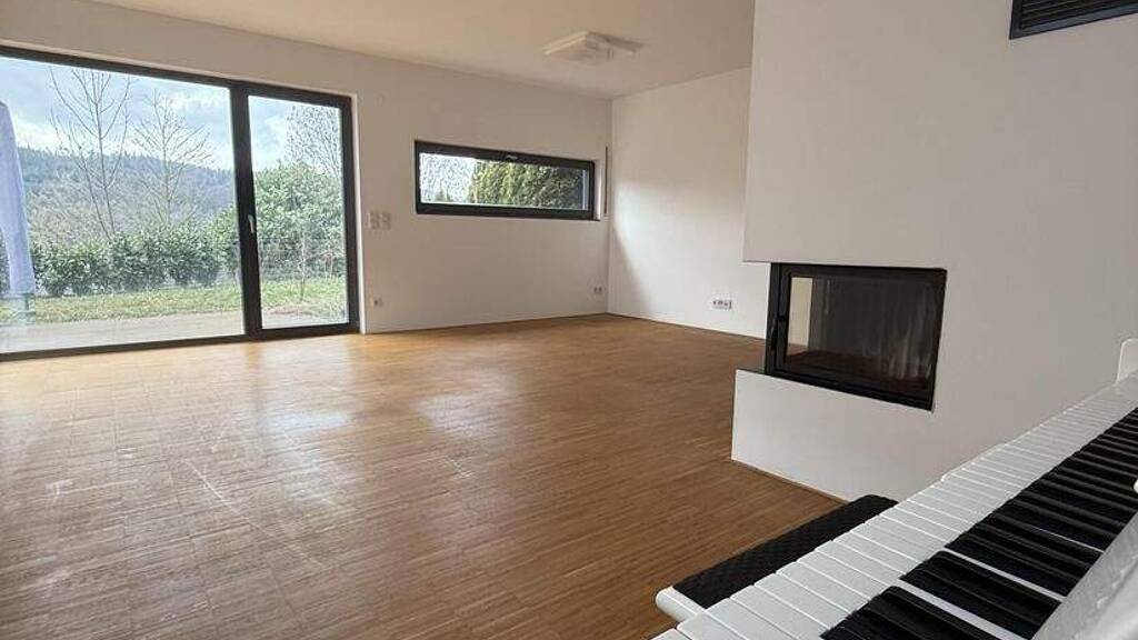 Große Fensterflächen schaffen eine helle und offene Atmosphäre. Der Wohnbereich mit Kamin bildet das Herzstück des Hauses und bietet Zugang zum Garten.