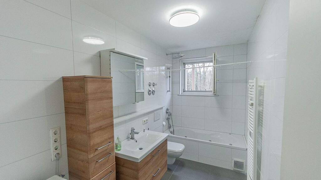Über einen Flur erreichen sie linker Hand das Tageslichtbad. Dieses ist ausgestattet mit einem Handtuchwärmer, einer Duschwanne und einem Waschmaschinen-Anschluss. Im weiteren Verlauf sind 2 Schlafzimmer angeordnet. Der Bodenbelage besteht aus einem Eichendielenparkett.
