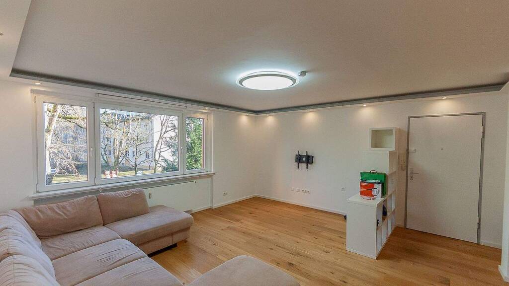 Die Wohnung befindet sich im 1. Obergeschoss eines gepflegten Mehrfamilienhauses. Nach dem Eingangsbereich betreten Sie nach einer kleinen Diele das sehr großzügige Wohnzimmer mit angrenzender offener Küche, die einen hochwertigen Charakter aufweist. Sowohl im Wohnzimmer als auch in der Küche sind Downlights angebracht, welche Sie dimmen können. Der Südbalkon ist von der Küche aus erreichbar.