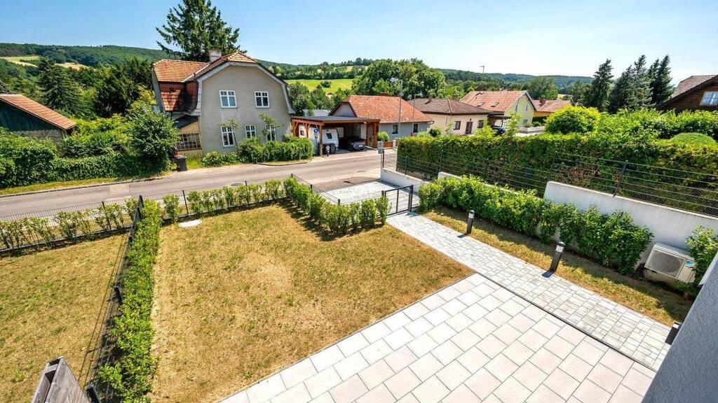 Im Obergeschoß erwarten Sie drei ruhige Schlafzimmer und ein großzügiges Badezimmer mit Fenster, das Tageslicht in Ihr Morgenritual bringt. Ein besonderes Highlight ist die großzügige Terrasse mit unverbaubarem Fernblick über die sanften Hügel des Wienerwalds - ein täglicher Luxus, der inspiriert und entschleunigt.