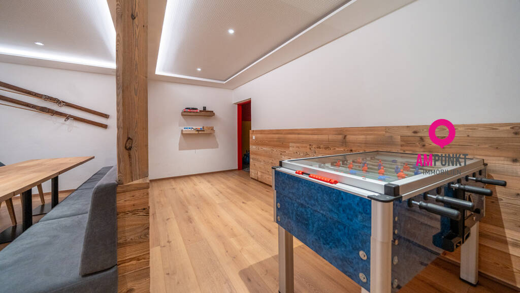 Im Untergeschoss erwartet Ihre Gäste ein Wellnessbereich mit Sauna, Dampfbad und Infrarotkabine - der ideale Rückzugsort nach einem Tag in den Bergen. Eine Lounge mit Tischfußball und ein Kinderspielzimmer bieten zusätzlichen Raum für Erholung und Spaß. Auch ein Skistall und ein Fahrradraum stehen zur Verfügung, damit das Sportequipment sicher verwahrt ist.