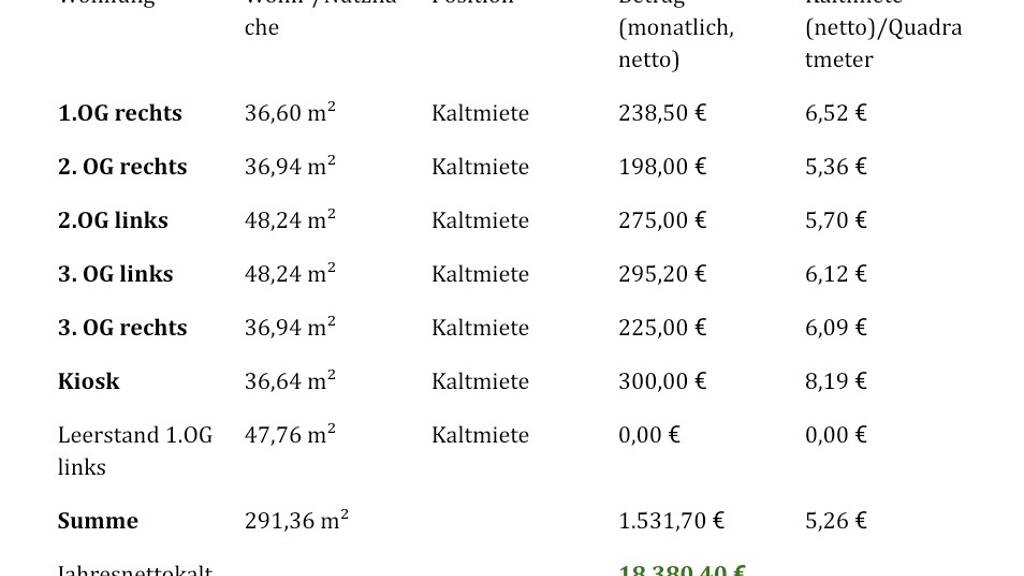 Die aktuelle Kaltmiete beträgt 4.171,70 € monatlich. Das Mietpotenzial liegt bei 6.021 € monatlich.