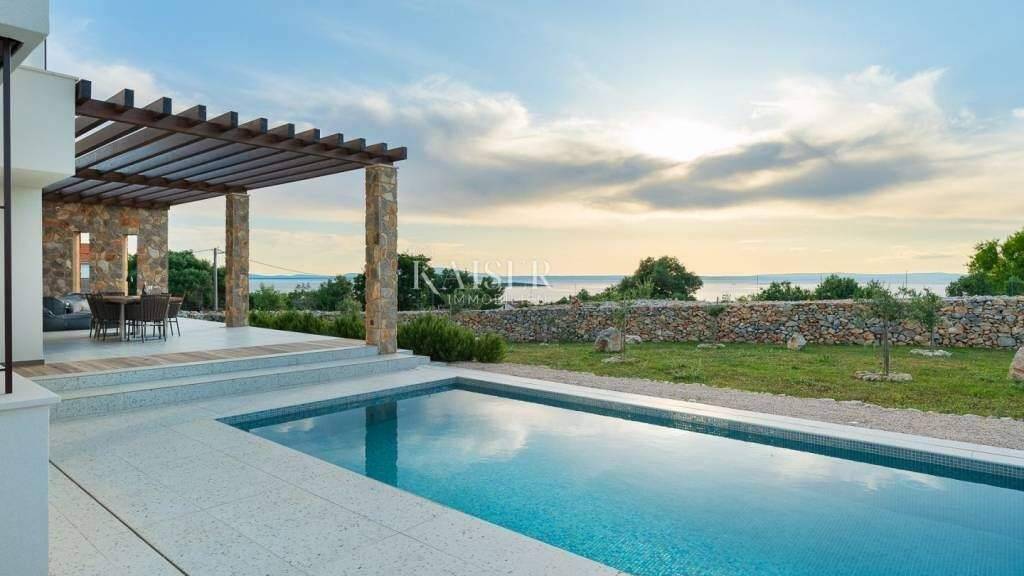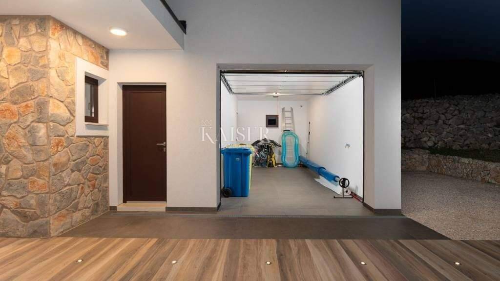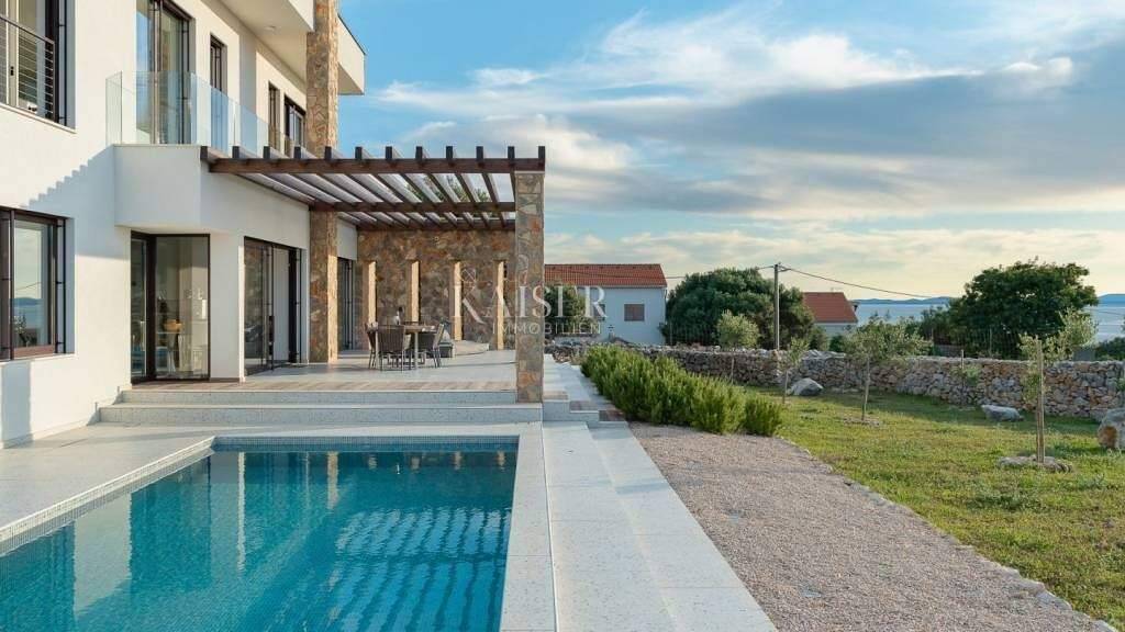 Kaiser Immobilien präsentiert stolz eine moderne Villa aus dem Jahr 2021 auf einem großzügigen Grundstück von 1707 m², umgeben von Olivenhainen. Die Villa wurde nach hohen Standards gebaut, wobei auf jedes Detail geachtet wurde. Die Fassade ist mit speziell ausgewähltem Stein von der Insel Brac verkleidet, was ihr einen besonderen Charme und Langlebigkeit verleiht.