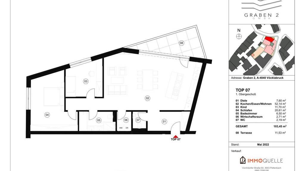 In zentralster Innenstadtlage von Vöcklabruck befindet sich diese elegante Stadtwohnung mit Terrasse im ersten Obergeschoss eines exklusiven Immobilienprojektes zwischen Graben 2 und der Jungmairgasse. Dank ihrer Exposition ist dieses seltene Schmuckstück von der Straße aus nicht einsehbar und wartet lediglich darauf, von einem wertschätzenden Käufer bis zur Fertigstellung im Dezember 2025 entdeckt zu werden.