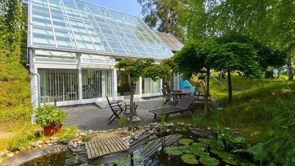 Gebaut in Höhlenhaus-Bauweise, schmiegt sich das Gebäude an die Landschaft. Die Nordseite ist geschützt in das Erdreich eingebettet, was das Haus zusätzlich isoliert. Zur Südseite hin öffnet sich das Gebäude mit einer großflächigen Glasfassade, die nicht nur maximales Tageslicht herein lässt, sondern auch die passive Nutzung der Sonnenenergie ermöglicht. Dieses Öko-Solar-Architektenhaus wurde konsequent nach baubiologischen Prinzipien errichtet und überzeugt u.a. durch eine wohldurchdachte, hochwertige Ausstattung mit Fokus auf Nachhaltigkeit und Wohnkomfort.