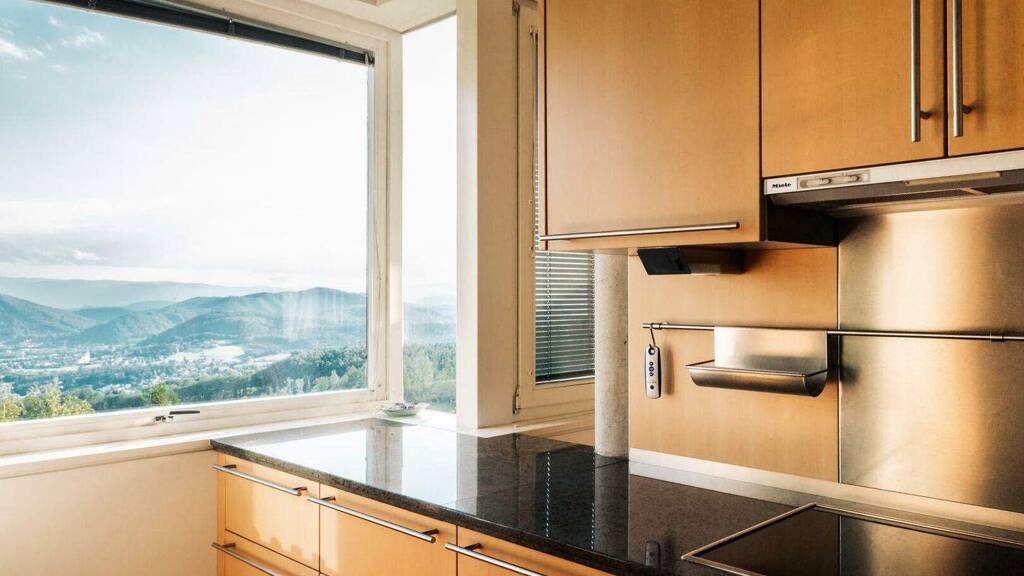 Sehr großzügiges Wohnzimmer mit bodentiefen Panoramafenstern, Ess-Bereich, Studio und Balkon, Küche mit Essbereich, Aussicht auf Graz, zweitem Balkon, belüfteter Speisekammer und Gästebereich mit Badezimmer und extra WC. Eingangssituation mit Windfang.