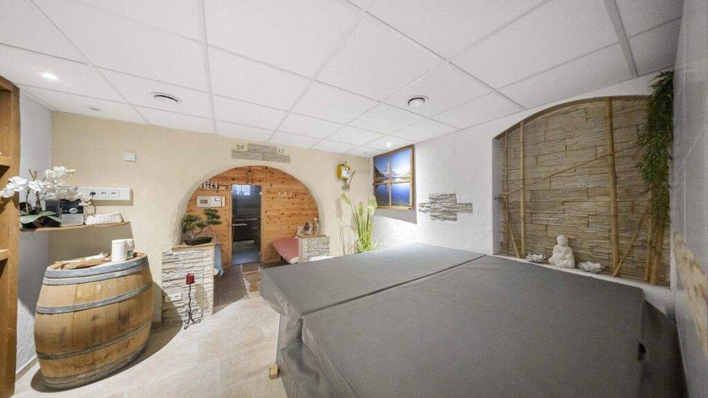 Im Untergeschoss befindet sich ein gemütlicher Partykeller, der regelmäßig für private Veranstaltungen genutzt wird. Ergänzend dazu wurde ein kleiner, ansprechend gestalteter Wellnessbereich mit Sauna und Whirlpool eingerichtet - ideal für die Erholung.