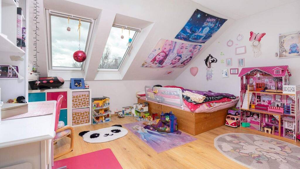 Über die innen liegende Treppe gelangen Sie in das Dachgeschoss. Hier befinden sich zwei weitere gut nutzbare Zimmer, die flexibel als Kinder-, Arbeits- oder Schlafzimmer genutzt werden können. Das Tageslichtbad ist funktional geschnitten und bietet eine Dusche und ausreichend Platz für die täglichen Bedürfnisse.