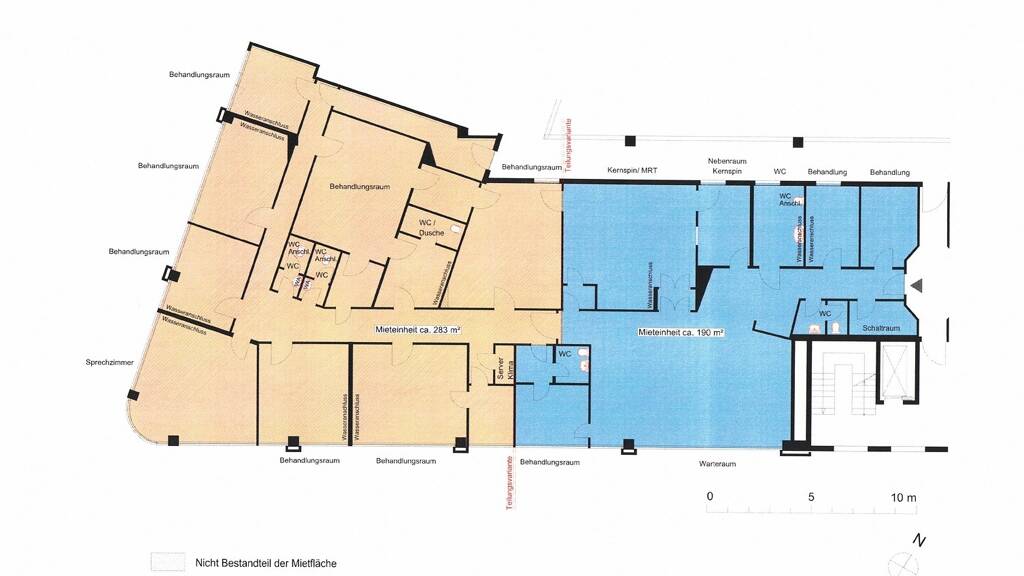 Es handelt sich hierbei um ein ca. 190 m² großes Objekt, das vormals über viele Jahre als Praxis für Neurochirugie genutzt wurde. Die Mietung befindet sich im 3. Obergeschoss und ist sowohl über zwei Treppenhäuser mit Fahrstuhl als auch über das Parkdeck zu erreichen. Durch die individuellen und unterschiedlichen Größenordnungen der jeweiligen Räumlichkeiten können vielseitige Konzepte für Firmen realisiert werden. Die Gewerbe-Einheit könnte auch vermieterseitig "entkernt" werden, um den zukünftigen Mieter eine Vielzahl von Möglichkeiten für den jeweiligen gewünschten Mietzweck der Fläche zu ermöglichen. Die Raumaufteilung kann aber auch bei Bedarf variabel gestaltet werden und es stehen für die Mieter und den potentiellen Kundenstamm ausreichend Pkw-Stellplätze auf dem Parkdeck zur Verfügung.