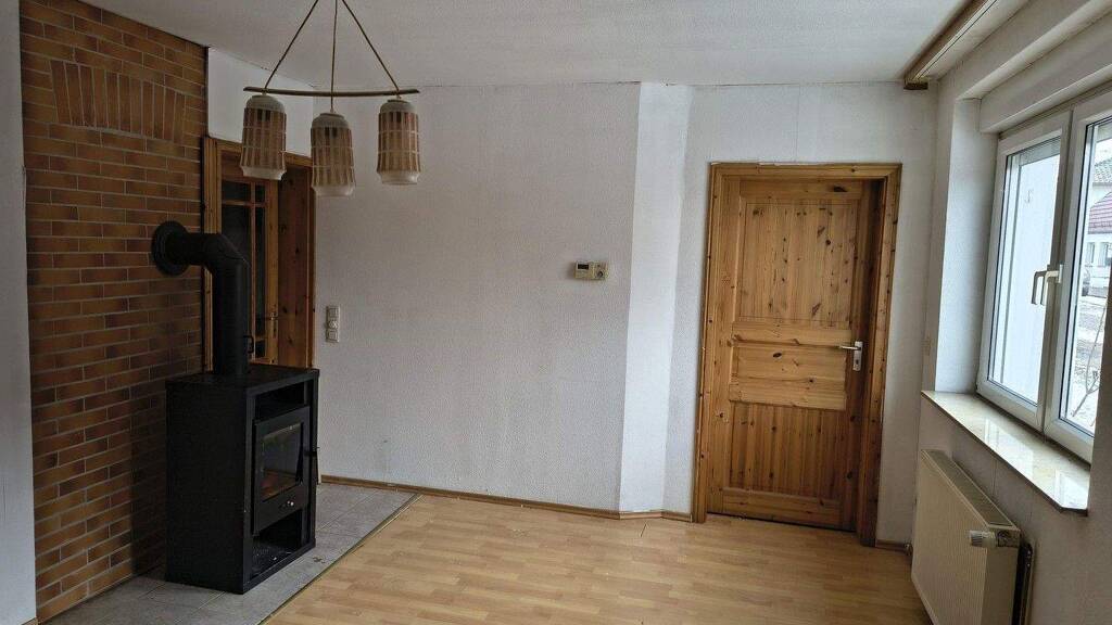 Die eine Haushälfte befindet sich im Erdgeschoss und war bis April 2025 vermietet. Der Mieter ist aus Altersgründen ausgezogen. Die linke Haushälfte wurde 2002 komplett grundsaniert und ist sofort bezugsfertig. Im Obergeschoss sind noch zwei Zimmer separat über den Hausflur zu erreichen. Das Dach ist komplett Wärmegedämmt. Die Dachgeschossräume und die rechte Haushälfte sind noch zu sanieren. Insgesamt hat das Haus sechs Zimmer, eine Küche, ein Bad und eine Waschküche. Es gibt für beide Haushälfte einen eigenen Zugang zum Garten. Im der noch zu sanierenden Teil sind auch noch zwei Kachelöfen vorhanden.