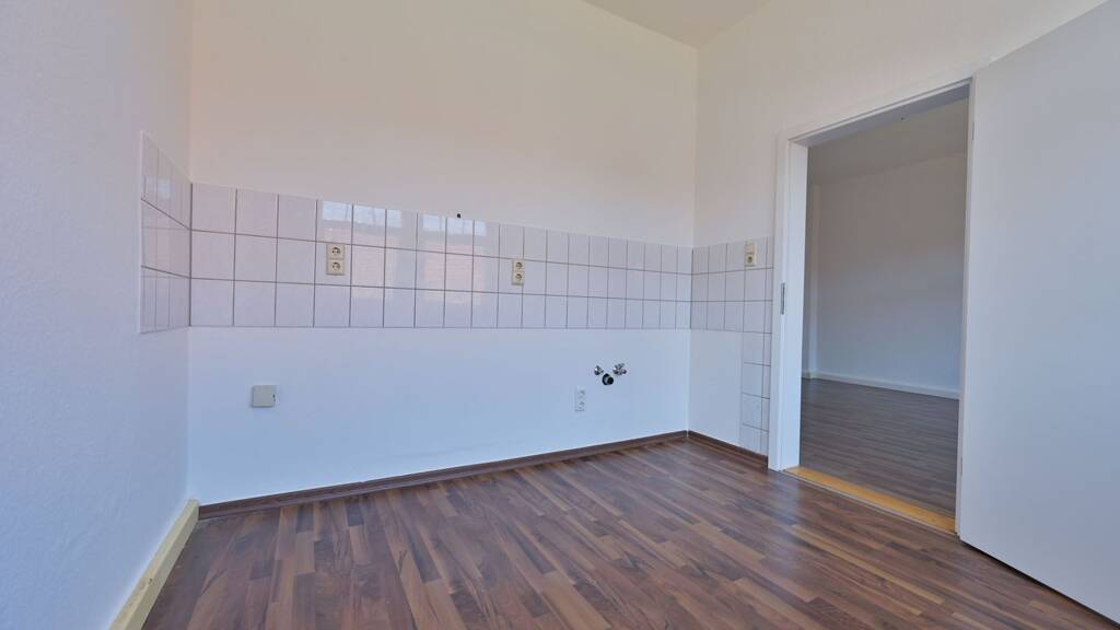 Die separate Küche bietet ausreichend Platz für eine moderne Einbauküche sowie einen kleinen Essbereich. Der in der gesamten Wohnung verlegte Laminatboden sorgt für ein einheitliches, gepflegtes Erscheinungsbild und unterstreicht den wohnlichen Charakter - auch im Küchenbereich.