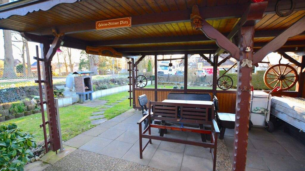 Der Garten bietet viel Platz zum Entspannen und wird durch eine Pergola ergänzt, die im Jahr 1984 errichtet wurde und einen schönen, geschützten Sitzbereich im Freien schafft.