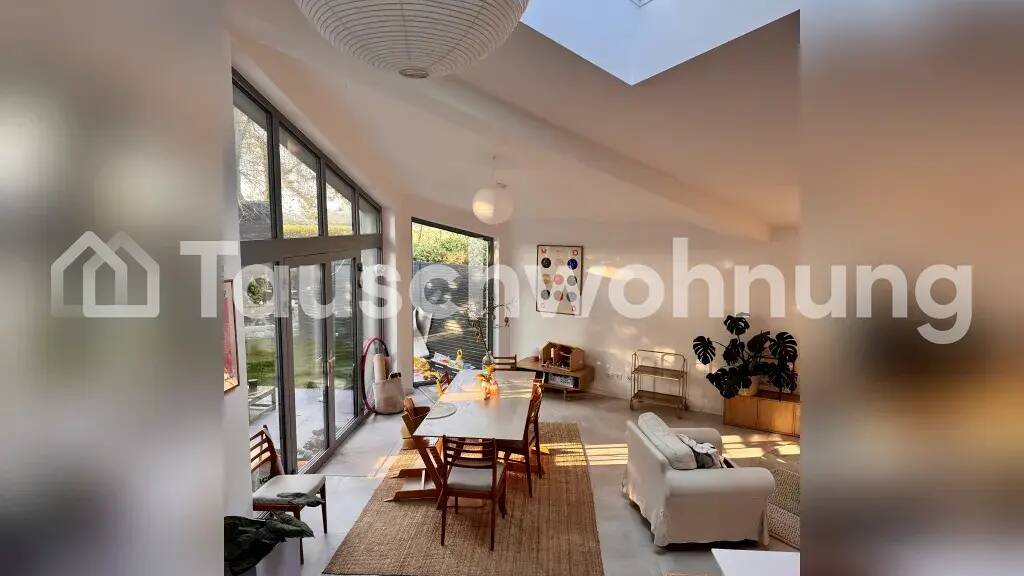 Es handelt es sich hierbei um ein Tauschangebot. (Anbieter-ID: 360965) Zu unserer Wohnung: 130qm auf 4 Zimmern (+ Ankleidezimmer) mit Loftcharakter, durch eine große Flügeltür verbinden sich Wohnraum und Garten/Terrasse. Die Räume sind mit hellem Parkett ausgestattet, der Wohnraum mit Natursteinplatten. Es gibt zwei schöne Bäder- eins mit ebenerdiger Dusche, eins mit Badewanne. Der ganze Schnitt ist sehr besonders und kein bisschen "Neubau-quadratisch". Es geht ein Weg vom Stellplatz ums Haus bis zum Garten- also ideal für Wege mit dem Kinderwagen, Einkauf und um die Kids ganz autark ums Haus spielen zu lassen. Den Sonnenaufgang und die Vögel auf dem Feld sieht man aus den bodentiefen Schlafzimmerfenstern. Die Wohnung liegt direkt an Wald und Wiesen, aber mit dem Auto nur 7 min. von Ehrenfeld.