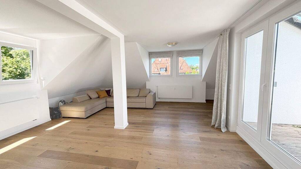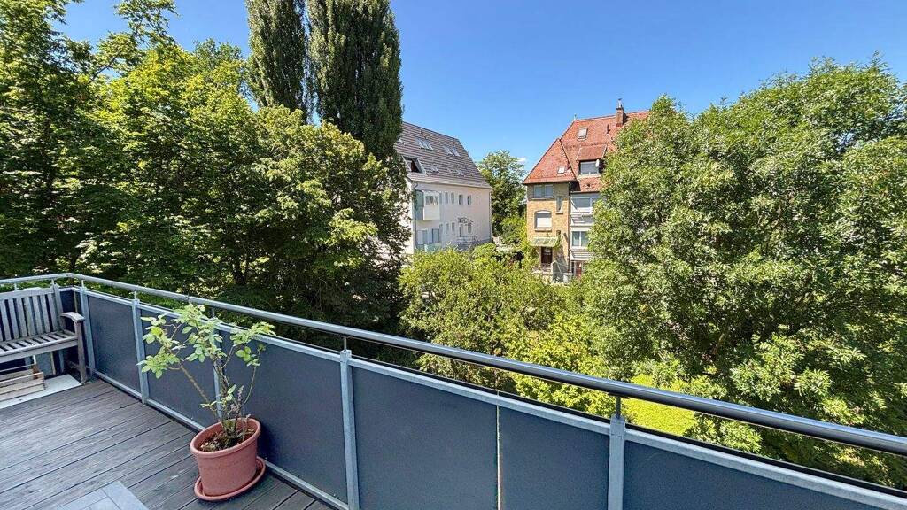 Die Ihnen exklusiv angebotene Maisonette-Wohnung befindet sich im 3. und 4. Obergeschoss eines im Jahr 2018 kernsanierten Mehrfamilienhauses. Die Wohnung ist lichtdurchflutet und verfügt über insgesamt 3,5 Zimmer, eine offene Küche sowie ein geräumiges Vollbad und verteilt sich auf ca. 115 m² Wohnfläche. Die Räumlichkeiten erstrecken sich über zwei Wohnebenen, welche über eine interne Treppe miteinander verbunden sind. Der Wohn-/Essbereich im 2. Dachgeschoss stellt das Herzstück der Wohnung dar und bietet Zugang zu einer ca. 10 m² großen Dachloggia mit herrlichem Blick über die Stadt. Die beiden Schlafzimmer in der unteren Etage bieten einen Zugang auf zwei Balkone. Die großen Fensteröffnungen transportieren viel Licht in die Räumlichkeiten und erzeugen eine freundliche Wohnatmosphäre. Hochwertige Ausstattungsmerkmale wie Holzparkettböden in den Wohnräumen, ein modernes Badezimmer sowie Einbauschränke unterstreichen den Wohnwert dieser Immobilie. Das Angebot beinhaltet des Weiteren einen PKW-Stellplatz im Hof (separat für 15.000 € zu erwerben) sowie einen Abstellraum im Keller. Darüber hinaus stehen ein Fahrradabstellraum und eine Waschküche zur gemeinschaftlichen Nutzung zur Verfügung.