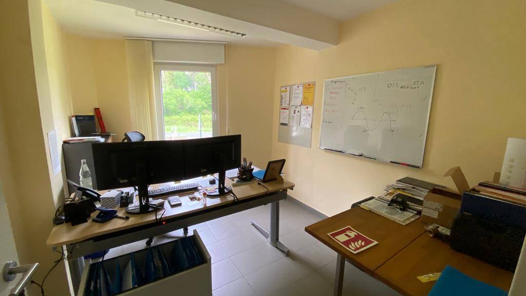 Das Objekt bietet im Erdgeschoß auf 100 m² Bürofläche, aufgeteilt in zwei größere und einen kleineren Raum. Zudem finden sich auf dieser Etage auch eine kleine Küchenzeile sowie ein WC. Dem Bürobereich ist auf gleicher Ebene eine Lagerfläche von ca. 156 m² angeschlossen.