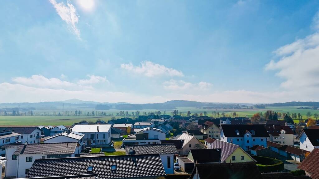 Zum Verkauf steht ein Luxus-Penthouse mit 2 Dachterrassen und Tiefgaragenstellplatz. Die Wohnung befindet sich im 2. Obergeschoss eines neu errichteten 8-Parteienhauses am Rande des südlich von Cham gelegenen Ortsteils Haidhäuser. Das Wohnhaus verfügt über eine Tiefgarage für die Bewohner, zugeteilte Kfz-Außenstellplätze sowie einen Fahrradraum im Untergeschoss. Das Treppenhaus ist mit hochwertigem Granit und Edelstahlhandläufen ausgestattet. Zudem verfügt es über einen Aufzug (Tiefgarage bis Dachgeschoss). Das angebotene Penthouse ist nach Süd-Westen ausgerichtet. Im Eingangsbereich verfügt die Wohnung über ausreichend Platz für Garderobe und Spiegel. Der offen gestaltete Wohn-, Ess-, Kochbereich (ca. 52 m²) mit Luxus-Einbauküche bietet Zugang zu den Dachterrassen (teils überdacht) und damit einen unvergleichlichen Ausblick auf das Chamer Umland. Das Schlafzimmer ist nach Osten ausgerichtet. Nebenan befindet sich ein begehbarer Kleiderschrank. Das Badezimmer bietet Waschplatz, Dusche, WC und Anschlüsse für die Waschmaschine.