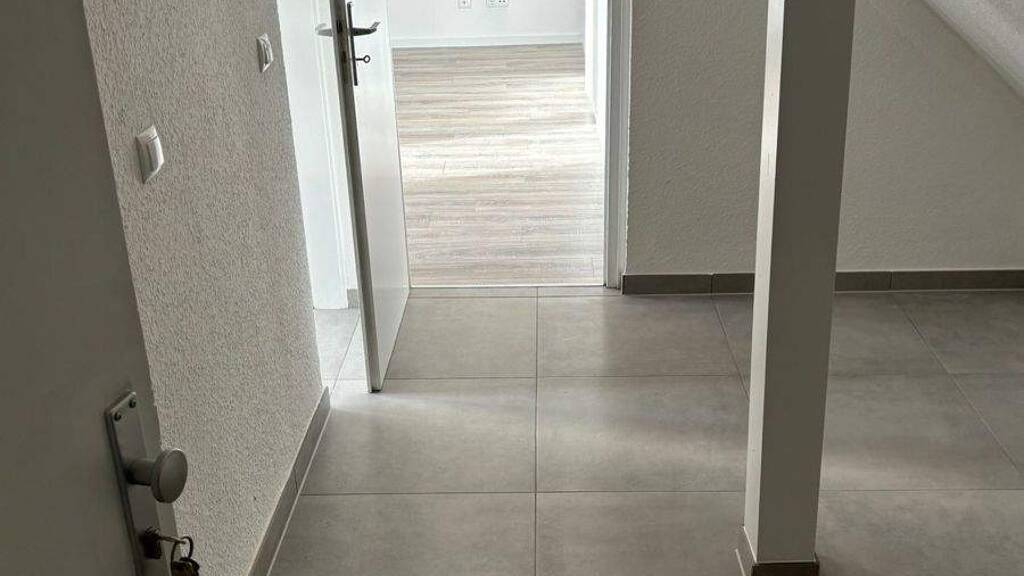 - Frisch renovierte Dachgeschosswohnung im 3. Stock - 1 Zimmer verteilt auf ca. 60 m² Wohnfläche - neues modernes Duschbad mit Tageslicht - separates WC (modernisiert) - Bodenbeläge: Fliesen und Laminat - Wasch- und Trockenraum im Keller - Stellplatz