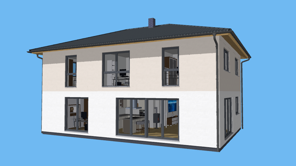 die auf der Grundlage zahlreicher Bauherrenwünsche entwickelt wurde. Großzügige und praktisch gestaltete Räume, die viel Stauraum bieten, laden zum Wohnen und Leben ein. Große Fensterflächen liefern den zukünftigen Bewohnern viel Tageslicht, wobei das Highlight des Hauses die wintergartenähnlichen Fenster im Wohnzimmer sind. Der Haustechnikraum ist groß genug, um auch Platz für die Technik einer PV-Anlage zu haben. Mit ca. 250 cm Raumhöhe bietet das Obergeschoss sehr viel Platz. Über einen Bodeneinschubtreppe können Sie den Dachspitz erreichen, der den Bauherren sehr viel Lagermöglichkeiten bietet.
