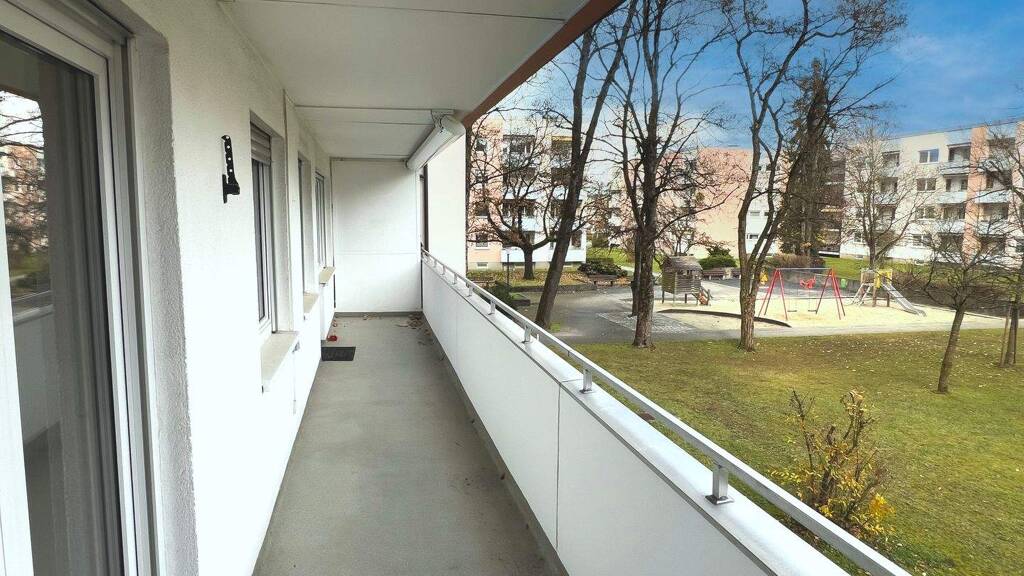 Vom Eingangsbereich gelangen Sie in den großzügig geschnittenen Flur mit Zugang zu sämtlichen Zimmern. Linker Hand befindet sich der Wohnbereich und eine angrenzende, praktische Abstellkammer. Der Wohnbereich bietet mit einer Fläche von ca. 20 m2 ausreichend Platz. Er verfügt über einen Zugang zur großzügigen ca. 16 m2 großen und nach Osten ausgerichteten Loggia, die sich über die komplette Wohnung erstreckt. Die Loggien wurden erst im Jahr 2019 im gesamten Haus saniert. Eine elektrische Markise ist vorhanden. Neben dem Wohnzimmer befindet sich die Küche, die mit einer EBK mit funktionstüchtigen Elektrogeräten ausgestattet ist. Angrenzend gelangen Sie in das Kinder- und das Schlafzimmer. Das Schlafzimmer verfügt ebenfalls über einen Zugang zum Balkon. Als Bodenbelag wurde hier Parkett gewählt. Die übrigen Zimmer sind gefliest. Gegenüber vom Kinderzimmer befindet sich das Bad, das mit einer Badewanne und einem Waschmaschinenanschluss ausgestattet ist.