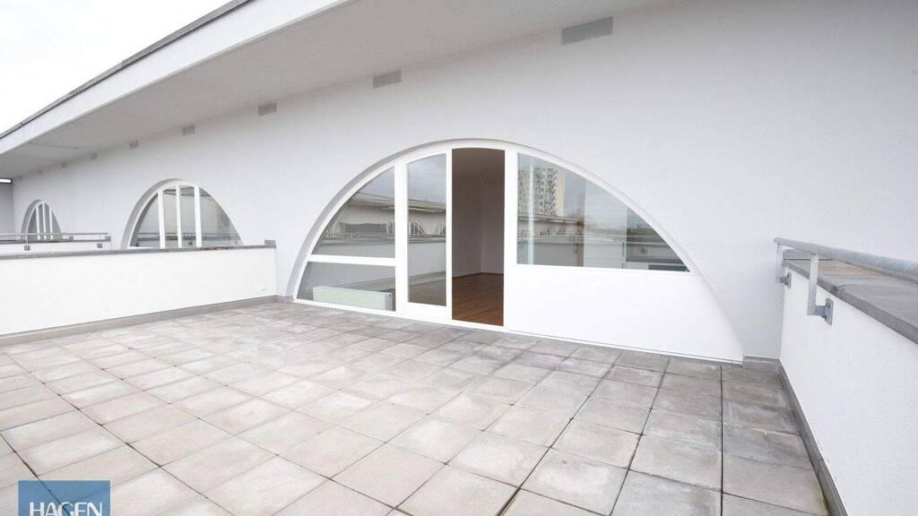 Das Highlight der Wohnung ist die großzügige Terrasse mit traumhaftem Panorama. Die einzigartige, bogenförmige Fensterfläche öffnet den lichtdurchfluteten Wohn-Essbereich zur Terrasse hin und schafft ein außergewöhnliches Wohnambiente mit viel Helligkeit und architektonischem Flair.