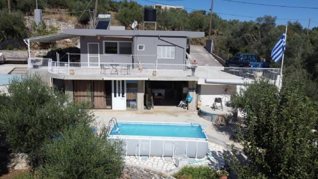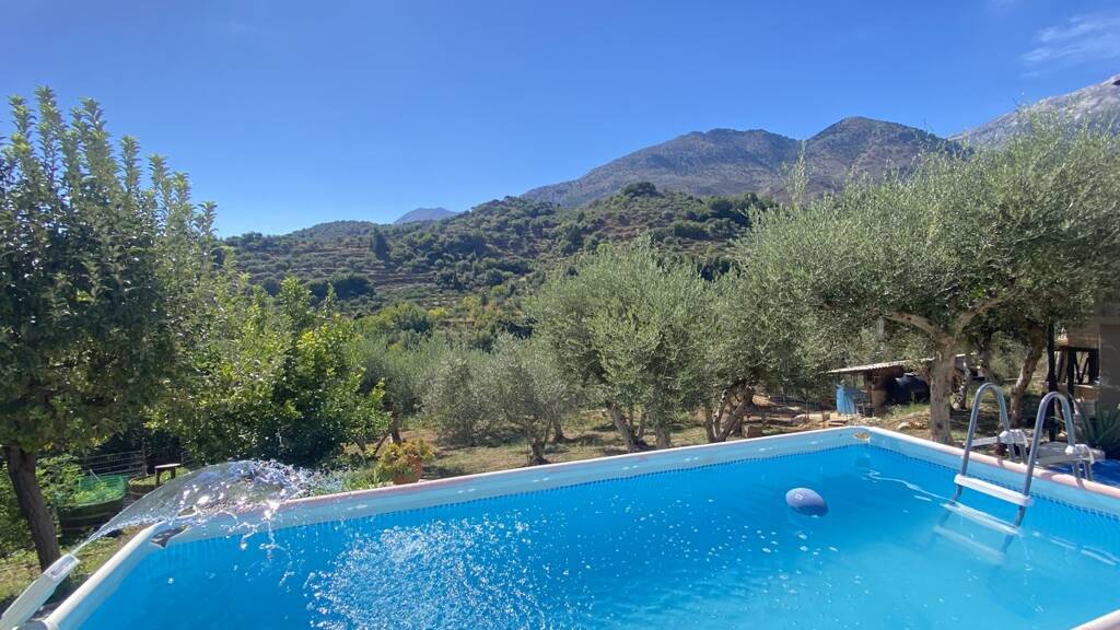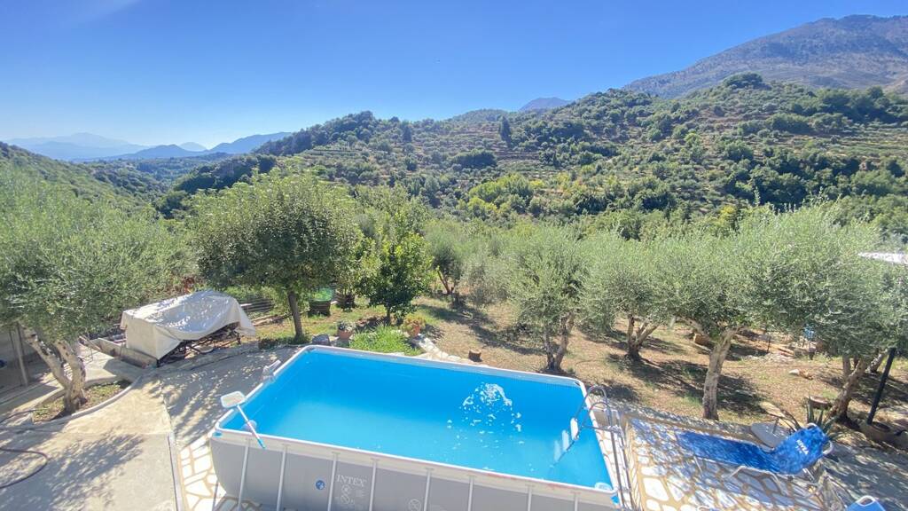 Beim Betreten des Hauses gelangt man in einen großzügigen offenen Wohn- und Küchenbereich. Die Küche ist voll ausgestattet, inklusive Waschmaschine, großem Kühlschrank sowie Herd mit Dunstabzugshaube. Zwei große Fenster in der Küche bieten einen atemberaubenden Blick auf die umliegenden Berge rund um das Dorf Kares.