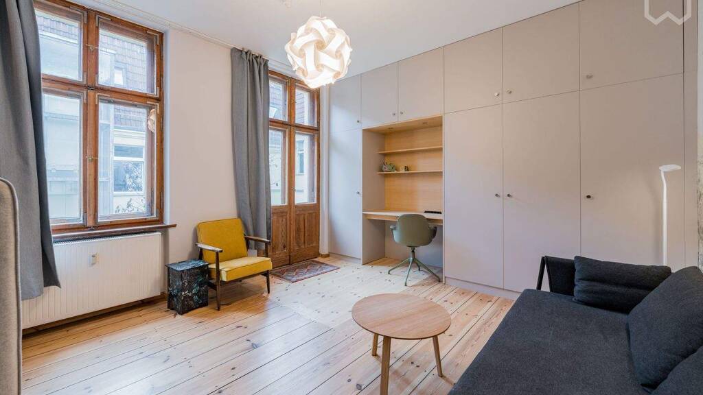 Dieser farbenfrohe Pop-up-Wohnraum befindet sich in einer wunderschönen Wohnung, die gerade frisch renoviert und mit einer ganz besonderen künstlerischen Note gestaltet wurde. Die Wohnung verfügt über ein Schlafzimmer für ein Paar oder alleinstehende junge Berufstätige, sowie einen Wohnbereich mit Home-Office und eine Küche mit Essecke. Ein Bad mit Dusche gehört ebenfalls zur Wohnung. Das auffällige Detail des Wohnzimmers ist der erstaunliche deckenhohe Stauschrank. Er scheint mit dem Raum zu verschmelzen, und sein zartrosa-grauer Farbton löst sich auf und schafft eine unglaubliche Leichtigkeit. Das erstaunliche Ornament auf der Tapete ist in kontrastierenden Farben gehalten, aber es harmoniert hervorragend mit dem Raum. Der Schlafplatz ist elegant in einer Ecke versteckt: die zukünftigen Mieter werden mit einem Blick auf den Himmel im Fenster aufwachen. Sie werden es auf den ersten Blick bemerken: Das wahre Schmuckstück der Wohnung ist die Farbwahl. In der Küche finden sich mattgraue Schränke mit dunklen Arbeitsplatten neben rostfarbenen Wänden und einer Vintage-Essgruppe. Die letzte Ergänzung dieser wunderbaren Wohnung ist die raue Textur der alten Holzböden im Flur und im Hauptraum: Sie verleiht ein ganz besonderes Gefühl von Wärme.