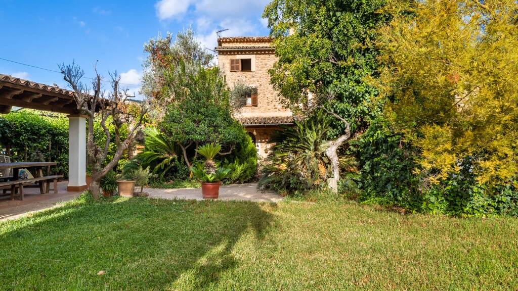 Die Au?enbereiche umfassen schattige Pl?tze zum Entspannen sowie eine Gartenveranda mit einer traditionellen Au?enk?che im mallorquinischen Stil und Grill, ideal f?r Mahlzeiten im Freien und geselliges Beisammensein.