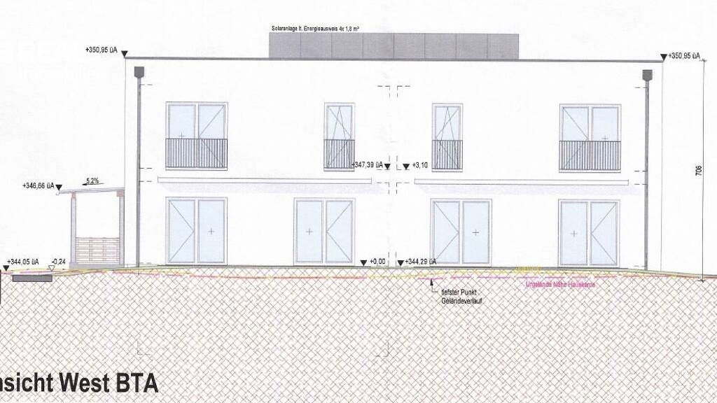 - baubewilligt (mit Bescheid vom 31.08.2022) ist der Neubau einer Wohnanlage mit 4 Wohneinheiten, Müllplatz, Einfriedung, überdachte PKW-Stellplätze sowie Geländeveränderungen
