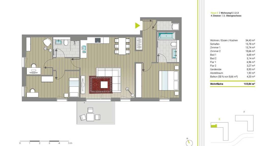 Die großzügige 4-Zimmer Wohnung befindet sich im 2. Obergeschoss von insgesamt 3 Etagen. Alle Fenster sind bodentief und durchfluten die Wohnung mit Licht. Die offene Küche und der angeschlossene Wohn-/Essbereich laden zu gemütlichen, geselligen Abenden mit Freunden und Familie ein. Ein Highlight der Wohnung ist der Sonnenbalkon mit Südausrichtung. Bei den Fenstern handelt es sich um Kunststofffenster mit besonderer Isolierung und Sonnenschutzverglasung, die sich durch elektrisch betriebene Rollläden bequem verdunkeln lassen und im Sommer einen optimalen Wärmeschutz ermöglichen. Zudem lassen sich die Rollläden über ein Smarthome System per App fernsteuern. Ein lebhaftes Eichenparkett wurde in allen Wohnräumen verlegt. Die Bäder sind mit modernen Fliesen in greige und hellgrau sowie Sanitäraustattung von Villeroy und Boch versehen. In allen Räumen wird mit Fußbodenheizung geheizt. Die schlichten Armaturen und der elektrisch betriebene Handtuchheizkörper verleihen dem Bad Hochwertigkeit und Eleganz. Eine Waschmaschine steht in einem Abstellraum innerhalb der Wohnung bereit.