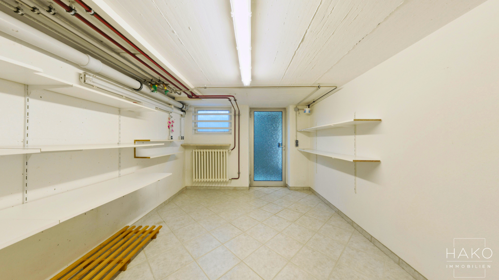 Das Kellergeschoss bietet eine Diele, einen Heizraum, einen Öltankraum, eine Waschküche, einen Lagerraum sowie einen weiteren Kellerraum. Eine Außentreppe ermöglicht von hier aus einen direkten Zugang in den Garten. Die großzügigen Räume und der gut durchdachte Grundriss schaffen eine angenehme Wohnatmosphäre und eröffnen gleichzeitig vielseitige Gestaltungsmöglichkeiten.
