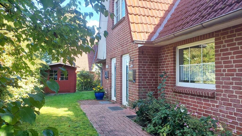 Etwas versteckt, in einem ruhigen, schönen Wohngebiet und von viel Grün umgeben, macht dieses gepflegte Zweifamilienhaus mit seinem herausragenden Friesengiebel unübersehbar auf sich aufmerksam. Der besondere Baustil wirkt gemütlich und einladend. Auch die hellen Sprossenfenster verstärken diesen Eindruck, der sich beim Betreten des Hauses bestätigt.