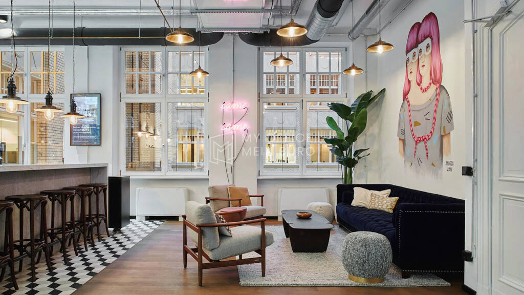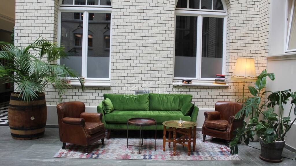 Die Innenausstattung legt großen Wert auf hochwertige Materialien: stilvolle Holzböden, edle Marmorelemente in der Küche und elegante, industrielle Details in den Räumen. Die Lounge-Bereiche laden mit gemütlichen Sitzgelegenheiten und erfrischendem Grün zum Entspannen oder informellen Treffen ein. Eine voll ausgestattete Küche mit modernen Geräten dient als perfekter Treffpunkt für Team-Events oder Kaffeepausen.