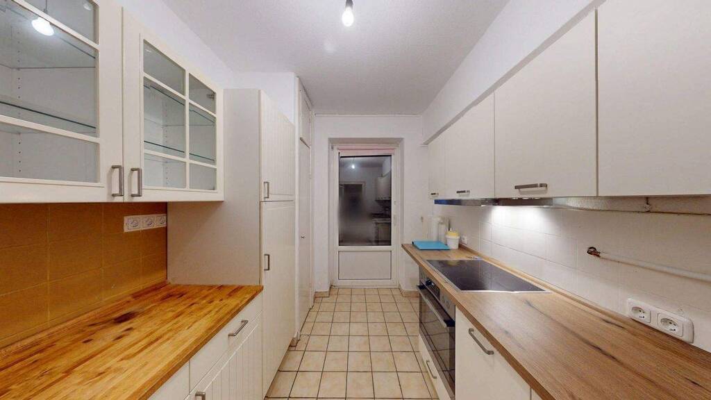 Die Küche ist mit einer zeitlosen Einbauküche und verschiedenen Elektrogeräten ausgestattet, darunter ein Herd und ein Ofen der Marke AEG. Von der Küche aus gelangen man zudem direkt auf den Balkon, der zusätzlichen Freiraum schafft und den Wohnkomfort erhöht.