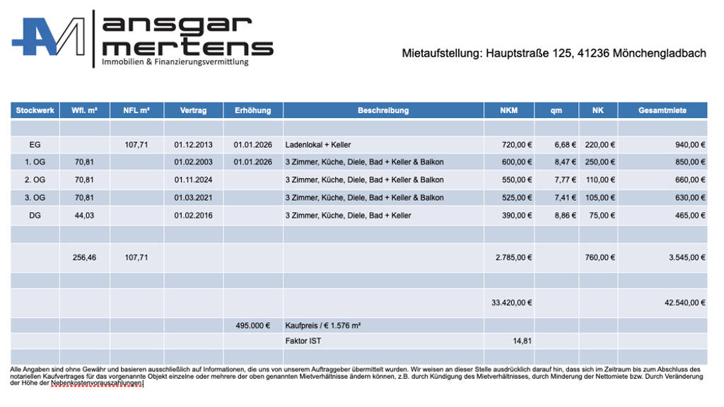 Die aktuelle Nettokaltmiete beträgt € 2.785,- monatlich, der Faktor der Immobilie liegt bei 14,81 und das in Innenstadtlage!