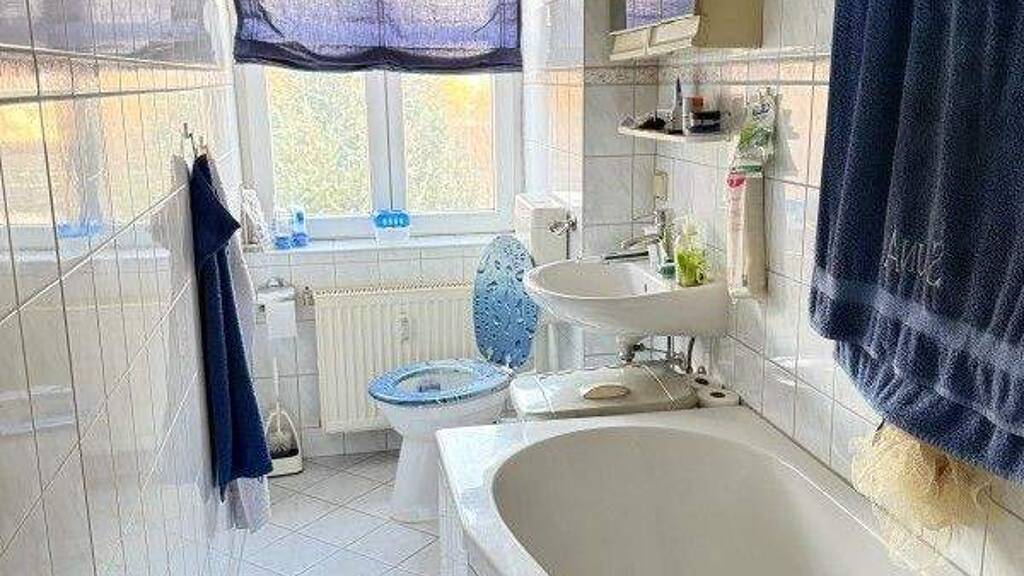 Das Tageslichtbad ist gefliest und ist mit einer Badewanne, HWB und einem WC ausgestattet.