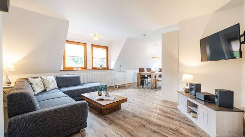 Das Dachgeschoss beherbergt eine eigenständige, charmante Wohnung, die bisher erfolgreich an Feriengäste vermietet wurde. Sie besticht durch eine große Wohnküche mit eigenem Balkon, ein Schlafzimmer, ein Tageslichtbad mit Dusche und ein weiteres Bad en Suite. Die hier abgebildete Möblierung ist, mit Ausnahme einzelner Dekorationsgegenstände, bereits im Kaufpreis inbegriffen. Der ausgebaute und begehbare Dachboden bietet zusätzlich Potenzial für eine weitere Nutzung.