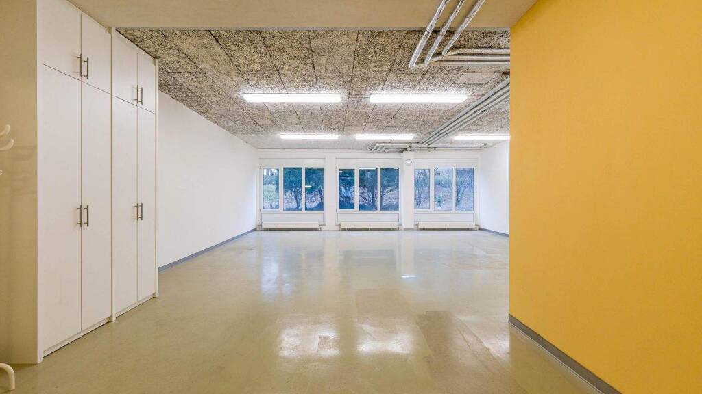 Die Ausstattung umfasst zudem eine Toilette mit Waschbecken sowie bereits vorhandene Anschlüsse für eine Einbauküche, was die Einrichtung eines Sozialraums oder einer Teeküche erheblich erleichtert.