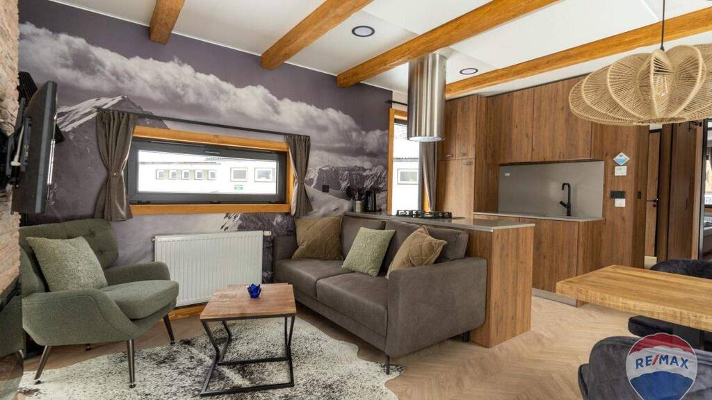 Im Inneren erwartet Sie ein gemütliches Wohnzimmer mit bequemer Sitzecke und Fernseher. Am großen Holztisch können Sie gemeinsam speisen. Die moderne offene Küche ist komplett ausgestattet mit Geschirrspüler, Backofen, Wasserkocher und Kaffeemaschine - alles für einen unbeschwerten Aufenthalt.