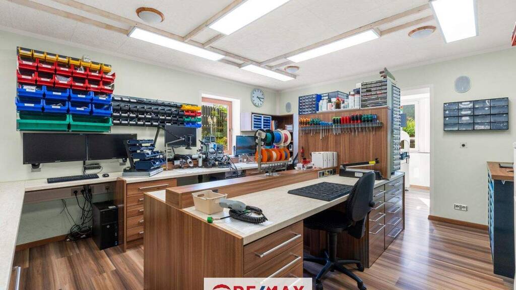 Eine separate Zufahrt sowie ein eigener Eingang führen in einen zusätzlichen Bereich, der sich flexibel als Arbeits- oder Wohnbereich nutzen lässt und vielseitige Nutzungsmöglichkeiten bietet.