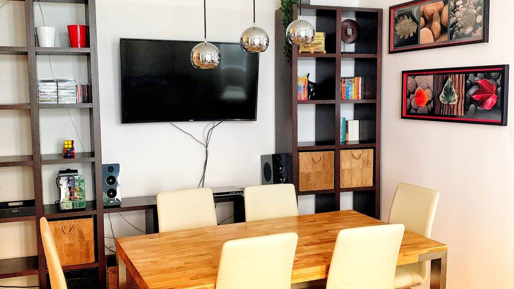 Großzügiger Vorraum, Badezimmer mit Wanne, separates WC, Wohnraum mit Küchenzeile, Esstisch und TV, großes Schlafzimmer mit viel Stauraum und extra Arbeitsplatz.