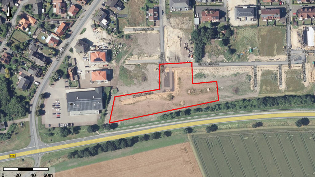 Südlich der Christian-Rath-Straße (genauer Spoedestraße 48 - 72), im Geltungsbereich des Bebauungsplanes (B-Plan), erstreckt sich das frische Baugebiet, das für die Errichtung von Wohnhäusern zum Ende 2024 freigegeben wurde. Dieses Gebiet grenzt im weiteren Osten an den Tatenhauser Weg, im Westen an die Schürenerstraße, und bietet durch seine Nähe zur Innenstadt eine attraktive Lage für Eigenheime und Wohnungen. In der näheren Umgebung befinden sich mehrere Kindergärten, Schulen und Freizeitmöglichkeiten wie z. B. ein Sportplatz und Wanderwege - eine attraktive Gegend für junge Familien. Auch die Nahversorgung ist durch naheliegende Supermärkte und Geschäfte sehr gut gewährleistet.