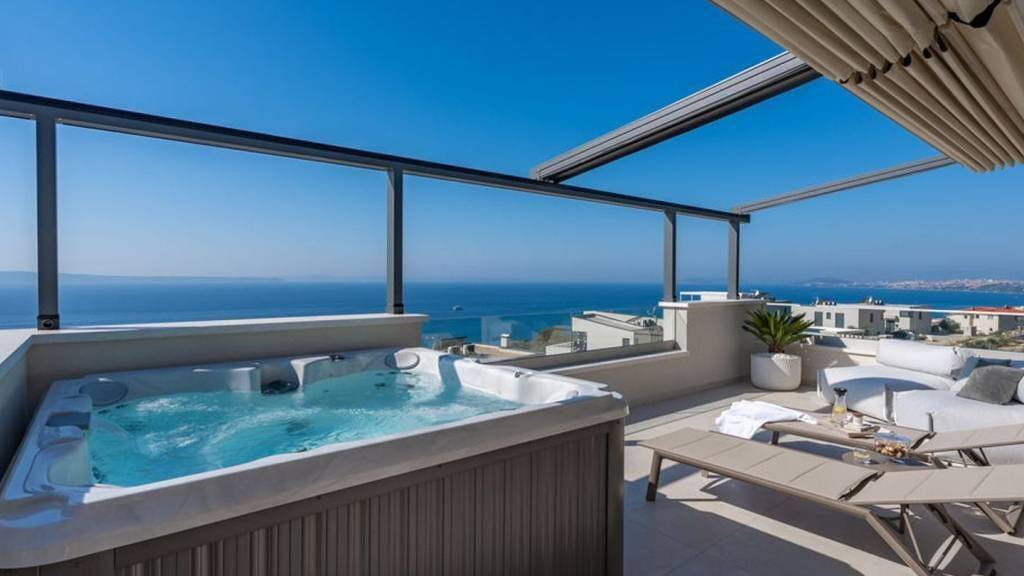 Die Villa verfügt über ein geräumiges Wohnzimmer mit Kamin, eine voll ausgestattete offene Küche mit Esszimmer, fünf komfortable Schlafzimmer, davon vier mit eigenem Bad, ein Gäste-WC, eine Waschküche und Abstellräume. Das Wohnzimmer führt direkt zu einer großzügigen, halbüberdachten Terrasse von 29 m2 mit einem Infinity-Pool von 36 m2, einem Sonnendeck und einer Sommerdusche mit Warmwasser. Der Pool verfügt über ein Wasserheizsystem und eine Elektrolyse-Wasserfiltration. Vom Esszimmer und der Küche aus hat man Zugang zu einer Terrasse mit Steingrill und einem Esszimmer mit Pergola. Im Obergeschoss gibt es einen Ruhebereich mit Sauna, Bar, Badezimmer und eine großzügige halbüberdachte Terrasse mit Whirlpool, Sonnendeck und wunderschönem Panoramablick auf das Meer und einen atemberaubenden Sonnenuntergang. Im Keller des Gebäudes befindet sich ein 30 m2 großes Spielzimmer mit Billard, Küche und Bad.