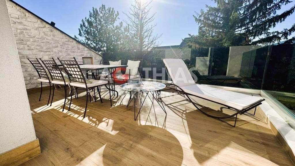 Das Dachgeschoss fungiert als eigenständige Einheit - offenes Schlafzimmer, Küche mit Essbereich, Badezimmer sowie eine großzügige Terrasse mit Aussicht, was diesen Bereich ideal für Gäste, ein Home-Office oder eine separate Wohnung macht.